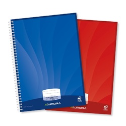 Caiet cu spirala metalica dubla. Hartie alba fara clor de 90 gr/mp. Coperta fata din carton color lucios, coperta spate din carton rigid. Numar de file: 50. Format: A4. Liniatura: dictando. 2 culori asortate: rosu, albastru.