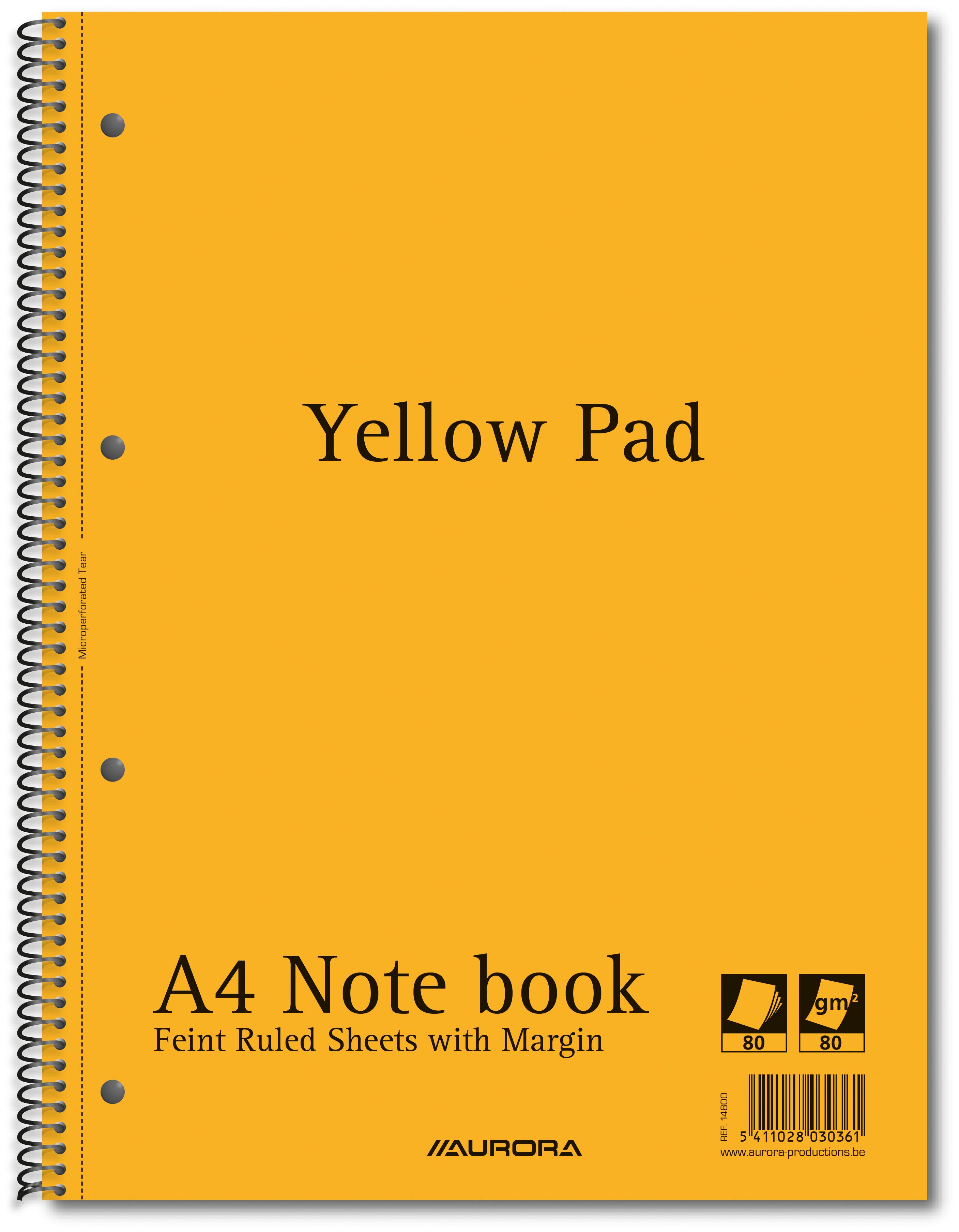 Caiet cu spirala metalica. Hartie galbena fara clor de 80 gr/mp prevazuta cu micropeforatii pentru desprinderea usoara a filelor si 4 perforatii pentru incopciere. Coperta fata si spate din carton color rigid. Numar de file: 80. Format: A4. Liniatura: dictando. Culoare: galben.