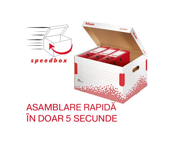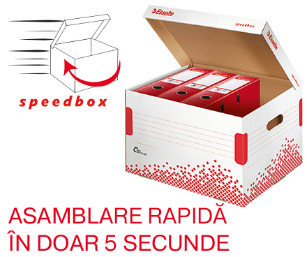 Cu Esselte Speedbox economisesti timp si efort. Sunt gata pentru utilizare dintr-o singura miscare. Se asambleaza usor si intuitiv, in doar cateva secunde, fara a avea nevoie de instructiuni. Margini si baza ranforsate cu carton dublu, pentru o mai buna rezistenta si transportul in...