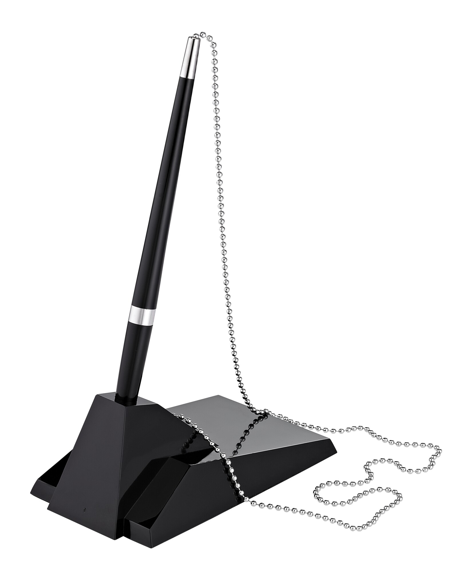 Pix din plastic fixat pe un suport rectangular, cu lantisor metalic. Suportul autoadeziv se fixeaza pe birou. Culoare scriere: negru.